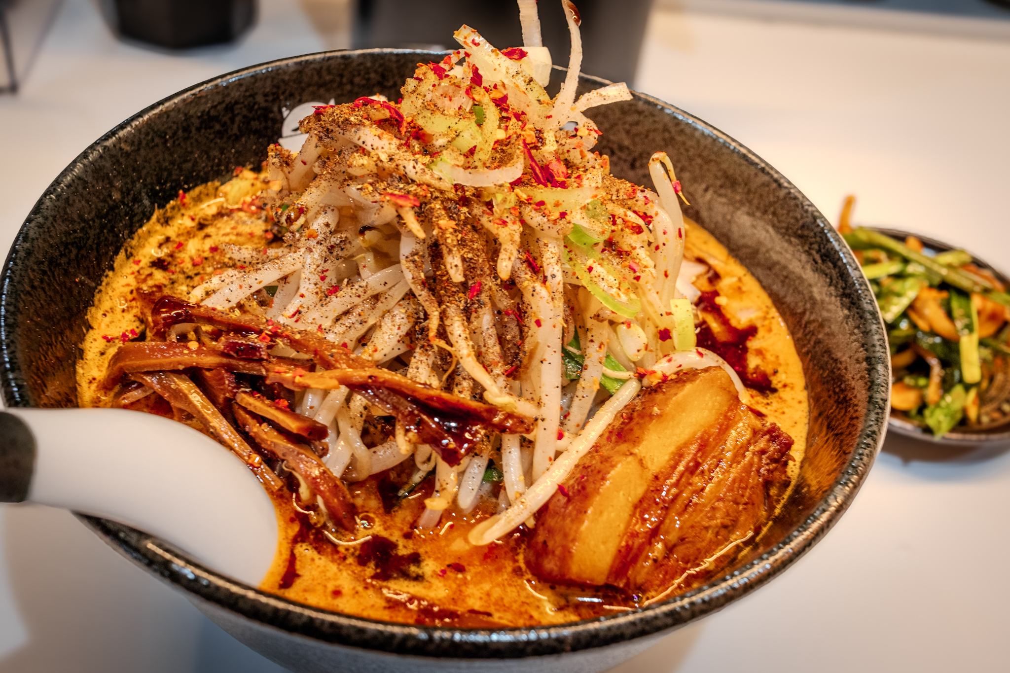 2025-11-08 2025年11月6日 らーめんぶたまろ@平塚 辛味噌ラーメンを大唐シビ増し 炒めもやしとニラ南蛮 甘々な味噌にカラシビがズバッと切り込んでくる 炒め野菜の香ばしさとニラ南蛮シャクシャクと酸味 こんな名店が平塚で手軽に食えるのありがたい… HDR写真の実験中